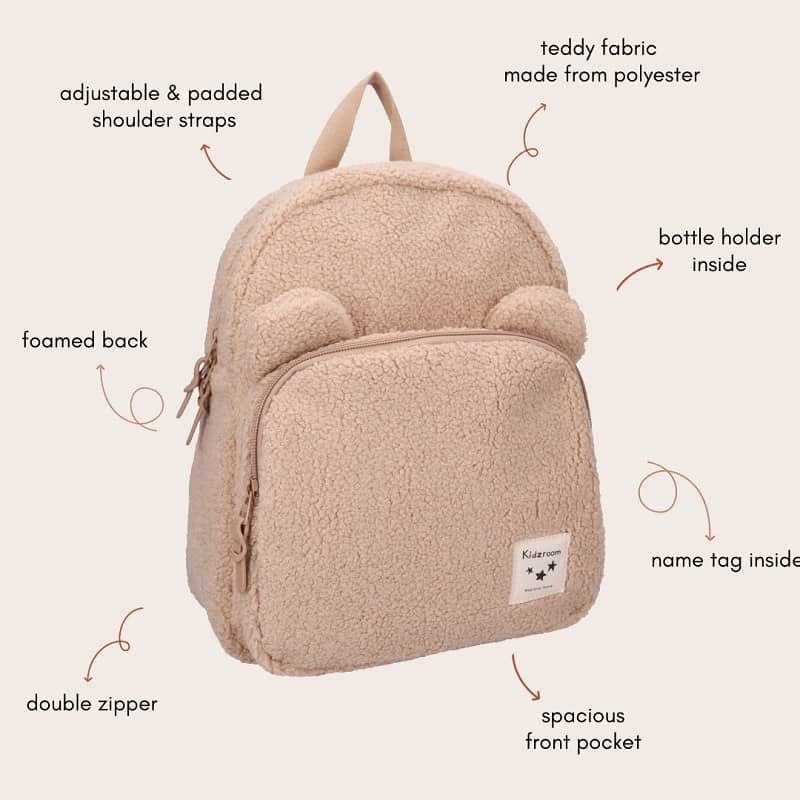 Pehme materjal, minimalistlik disain ja äratuntavad karukõrvad loovad sõbraliku ning kvaliteetse ilme, mis sobitub hästi laste moe trendidega. Seljakott pakub piisavalt ruumi kaisuloomadele, snäkkidele ja väiksematele koolitarvetele, sobides nii lasteaeda, hoidu kui ka koolitee alguseks.